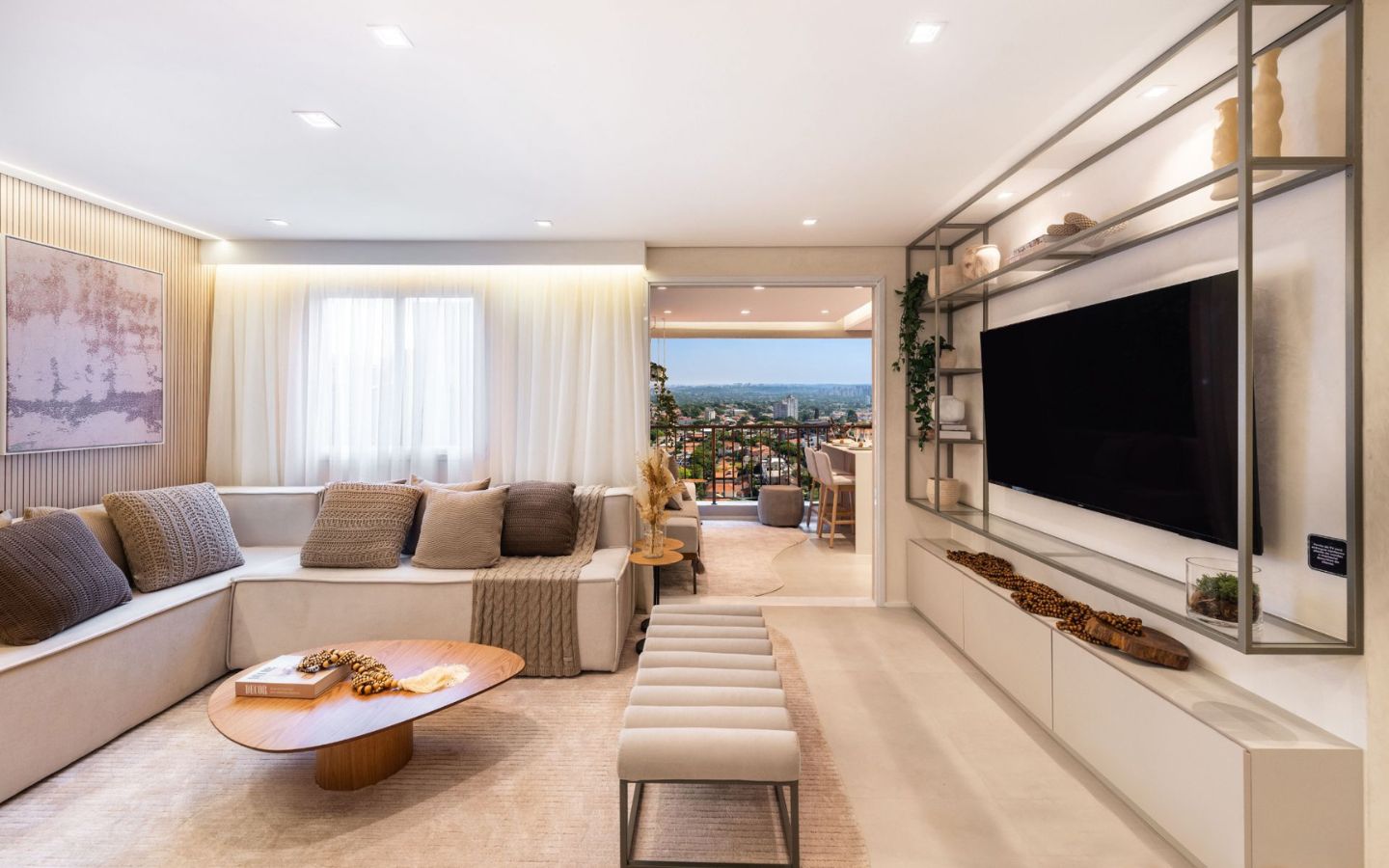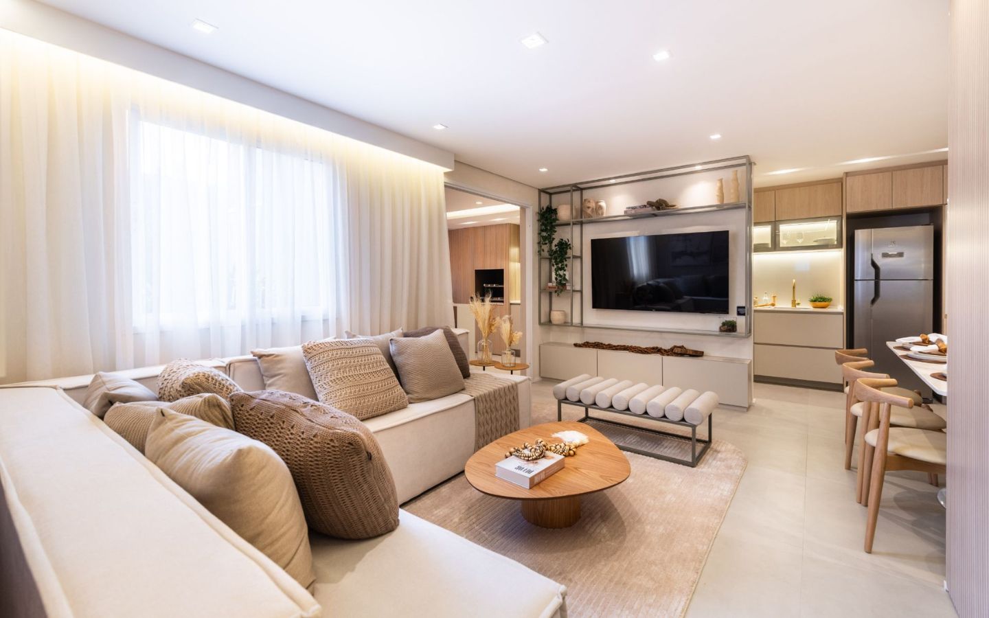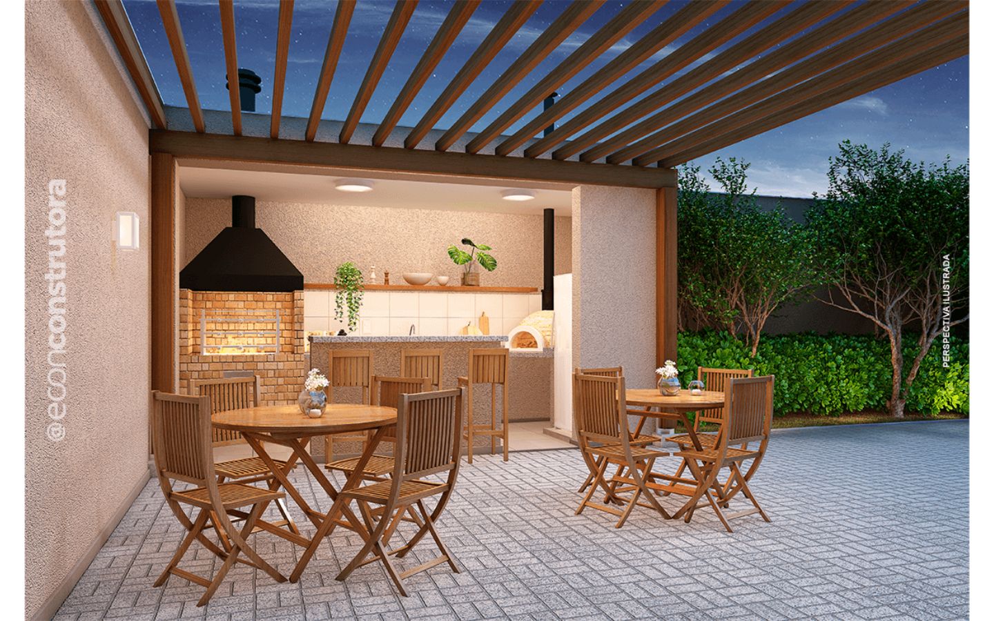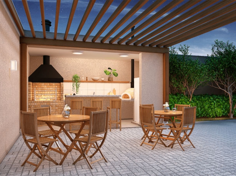 Varanda gourmet com churrasqueira a carvão, perfeita para momentos de descontração e para receber amigos e familiares. Espaço integrado entre sala, cozinha e varanda, proporcionando um ambiente amplo e acolhedor para toda a família.