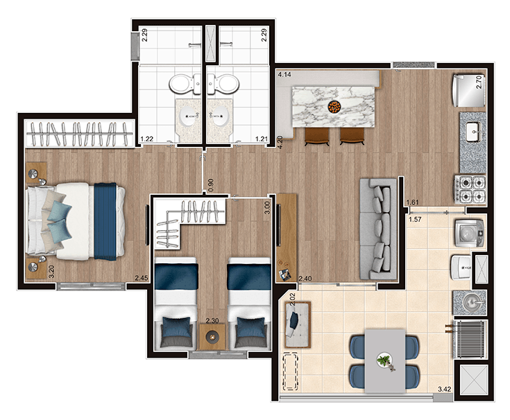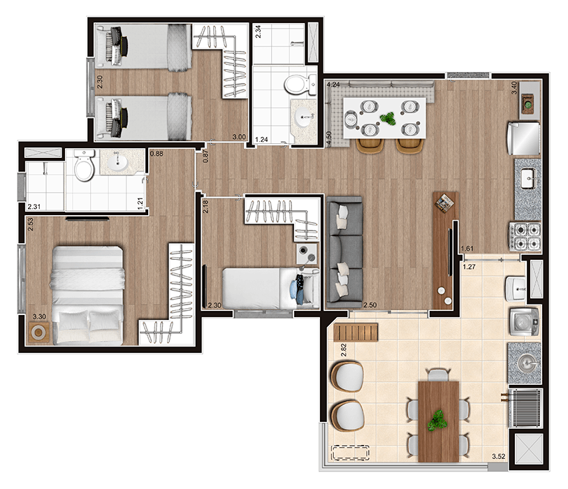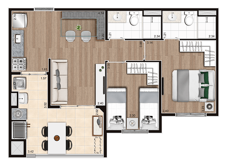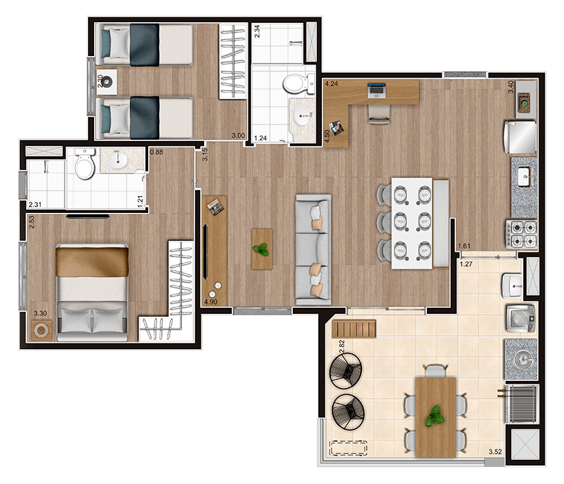 Apartamentos de 2 ou 3 dormitórios, todos com suíte, e uma estrutura de lazer com opções para a família.
