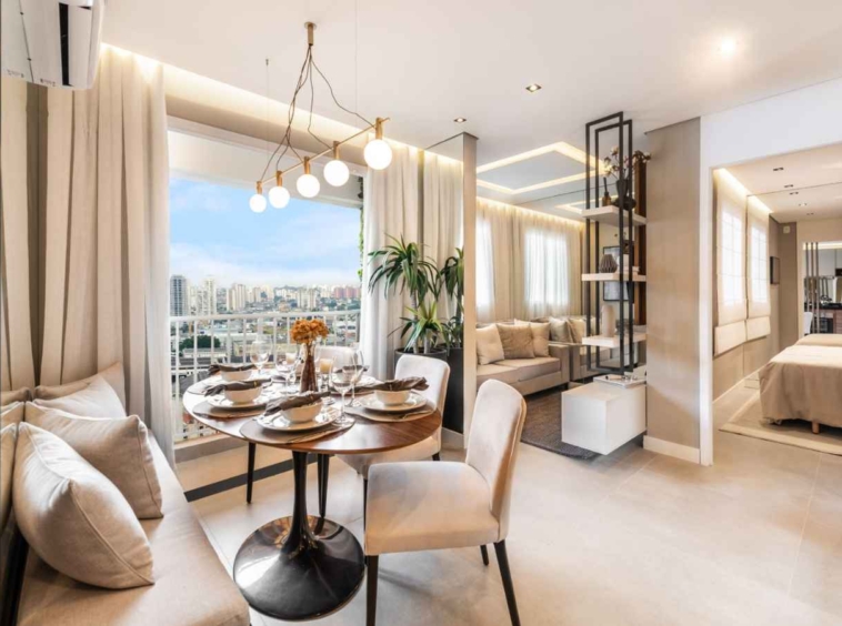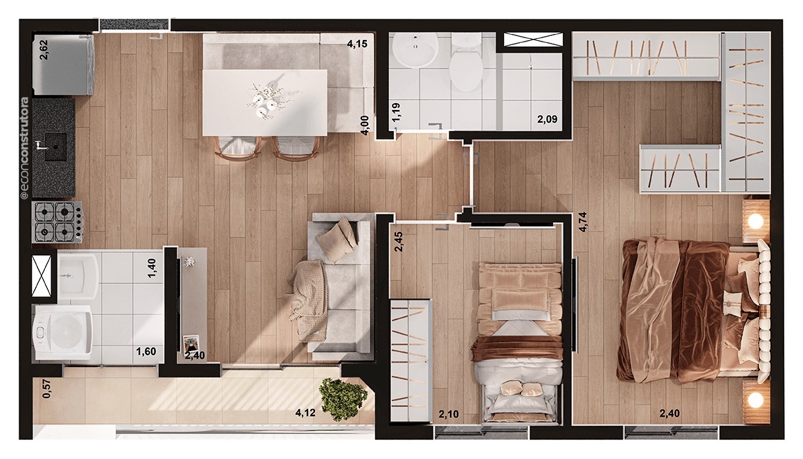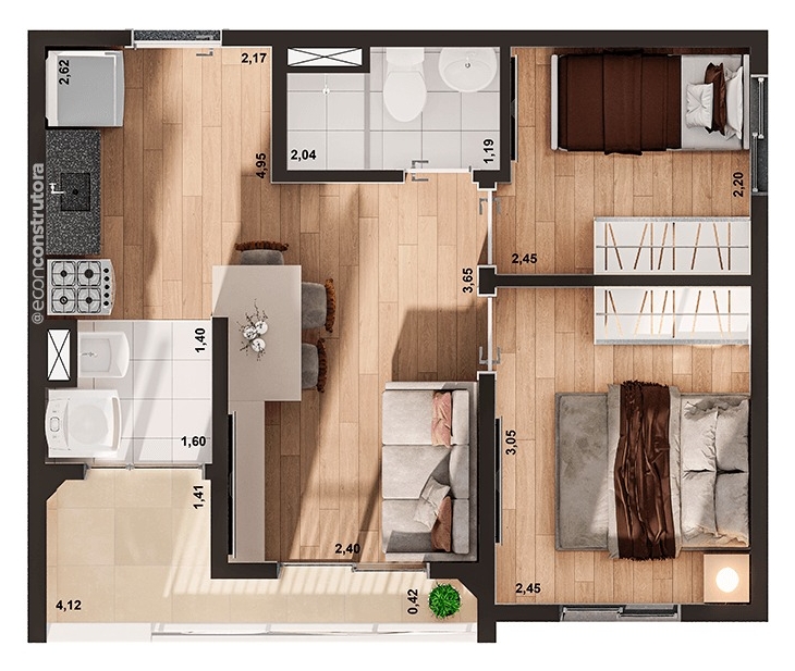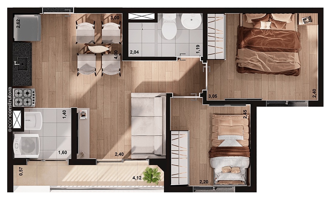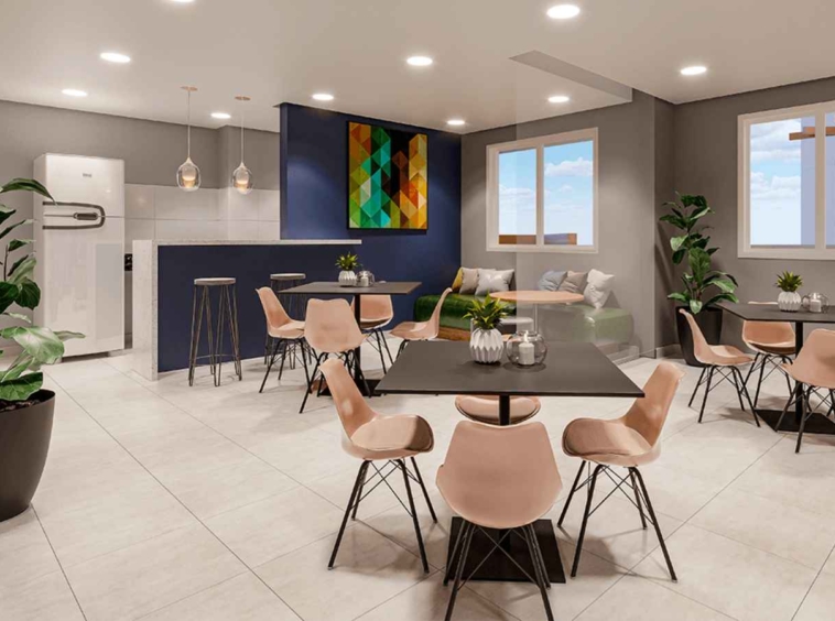 Apartamentos de 2 dormitórios, com uma linda varanda integrada, que possui abertura de 4m, ideal para quem gosta de ambientes bem arejados e com boa ventilação.